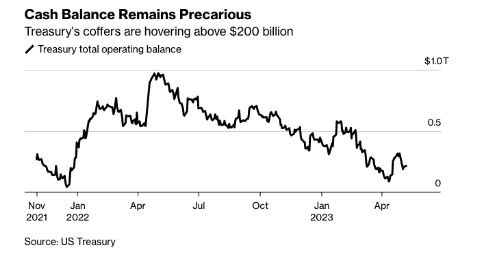 In the interim, the waning Treasury General Account (TGA) balance in tandem with the reduced ability to borrow could lead to some fits in risk asset markets that have been supported by TGA outflows for much of the Fed’s quantitative tightening program.