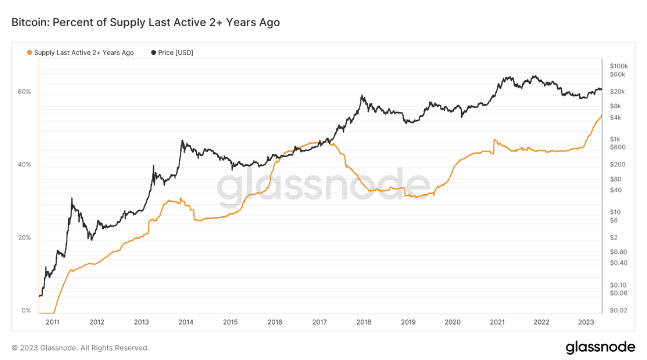 Perhaps the strongest signal amidst the ongoing economic uncertainty is the conviction of a majority of bitcoin holders. In spite of more than a 70% fall in exchange rate occurring since May of 2021, 54% of the bitcoin circulating supply has not budged over the last two years. In the face of historic inflation, dramatic bubble valuations, and crypto contagion, bitcoin is being accumulated for the long-term by a majority of the holder base.