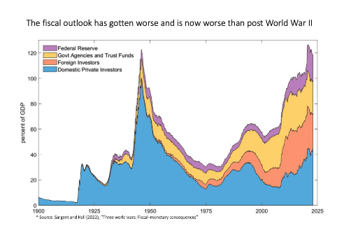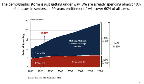 He highlighted the unprecedented Debt/GDP ratio of the United States, and how a rising interest expense along with retirement of the boomer generation who owed tens of trillions of dollars in off balance sheet entitlements, means the U.S. fiscal position is in a precarious position.