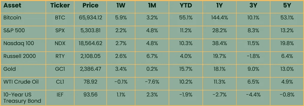 Bitcoin rallied 5.9% and was the best performing asset for the second week in a row, perhaps buoyed by news of large institutional allocations to bitcoin ETFs revealed in 13-F filings. The S&P 500 and Nasdaq 100 pierced new all-time highs yesterday as wild trading in meme stocks again took center stage. Oil continued to lag, keeping a lid on inflation expectations. Gold rallied and bond yields continued to retreat from their year-to-date highs, driving bond prices higher.