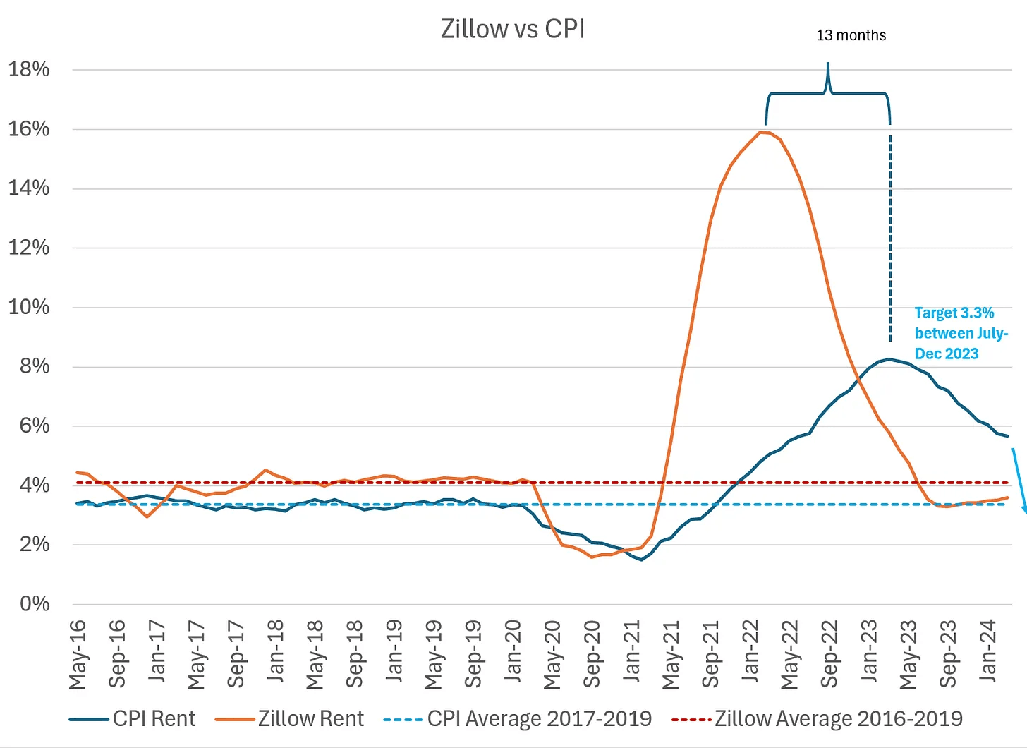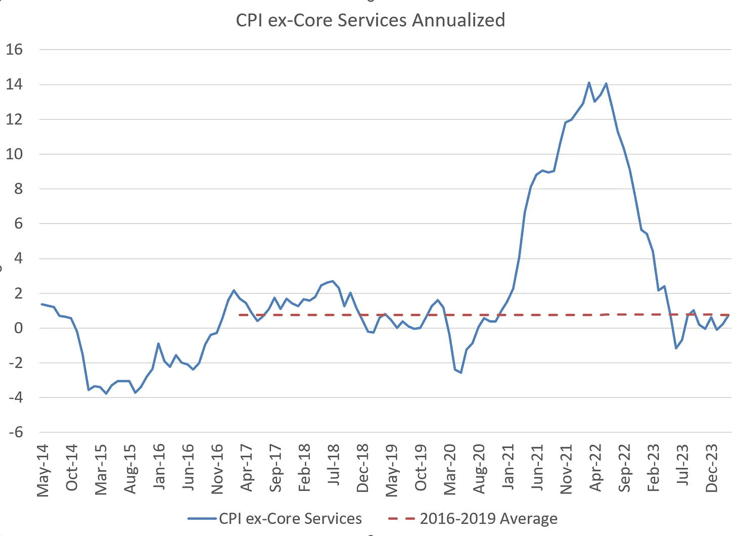 So shelter, which accounts for 34% of Core CPI, falling from its current shade under 6% to somewhere in the neighborhood of 2.5%, is already baked in the cake. This is going to be a significant headwind to reported CPI inflation for the rest of 2024.