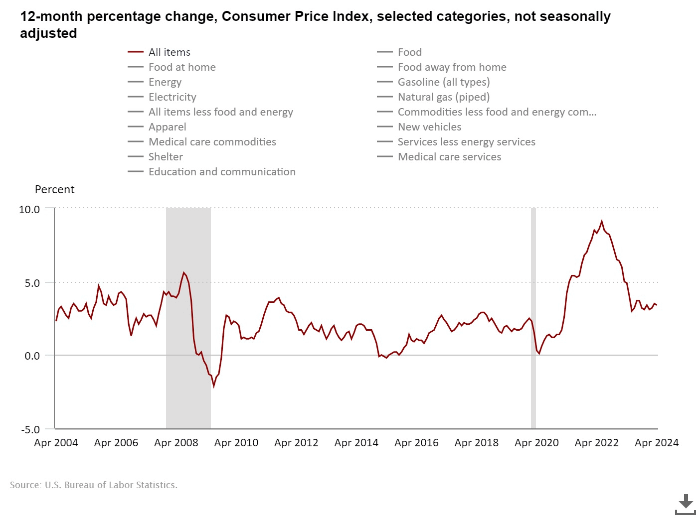 Yesterday morning, the Bureau of Labor Statistics (BLS), responsible for calculating measures of inflation, including the widely quoted and tracked CPI — Consumer Price Index — reported annual CPI inflation of 3.4% for the year ended April 2024.