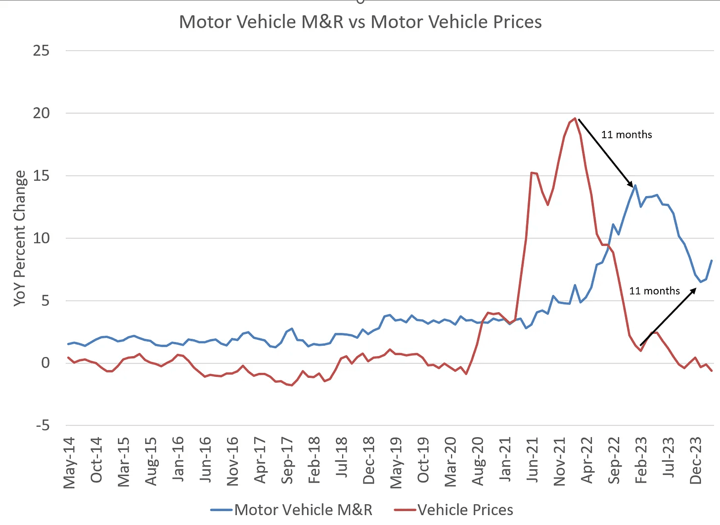 This has been driven by an increase in the price of car insurance and vehicle maintenance and repair, which lag used car prices.