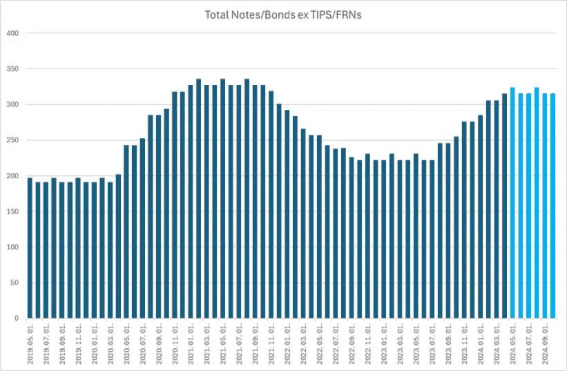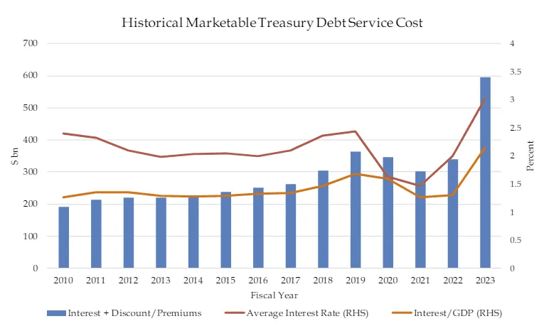 This chart in the Treasury Presentation to TBAC (page 49) shows how the cost of servicing our national debt has increased with the increase in debt as well as interest rates, and figures to go even higher in 2024: