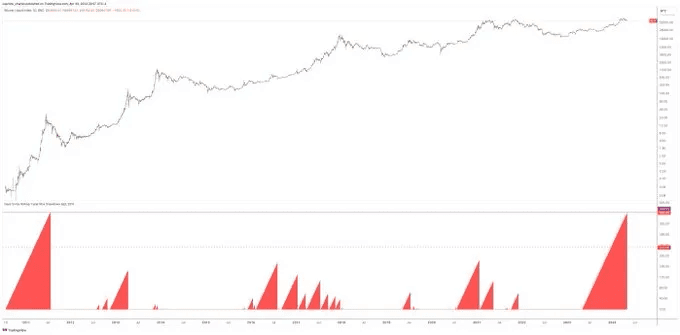 As of April 30 bitcoin has gone 362 days without a 25%+ drawdown, one shy of the record 363 days set in 2011.