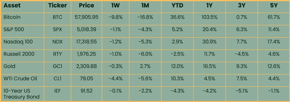Risk assets sold off over the past week ahead of the May FOMC and Treasury QRA. Bitcoin led markets lower, down 9.8%. Bitcoin has typically been the most liquidity sensitive asset, leading other assets both lower and higher at turning points in the market. Despite the drawdown, bitcoin is still by far the best performing asset year-to-date.