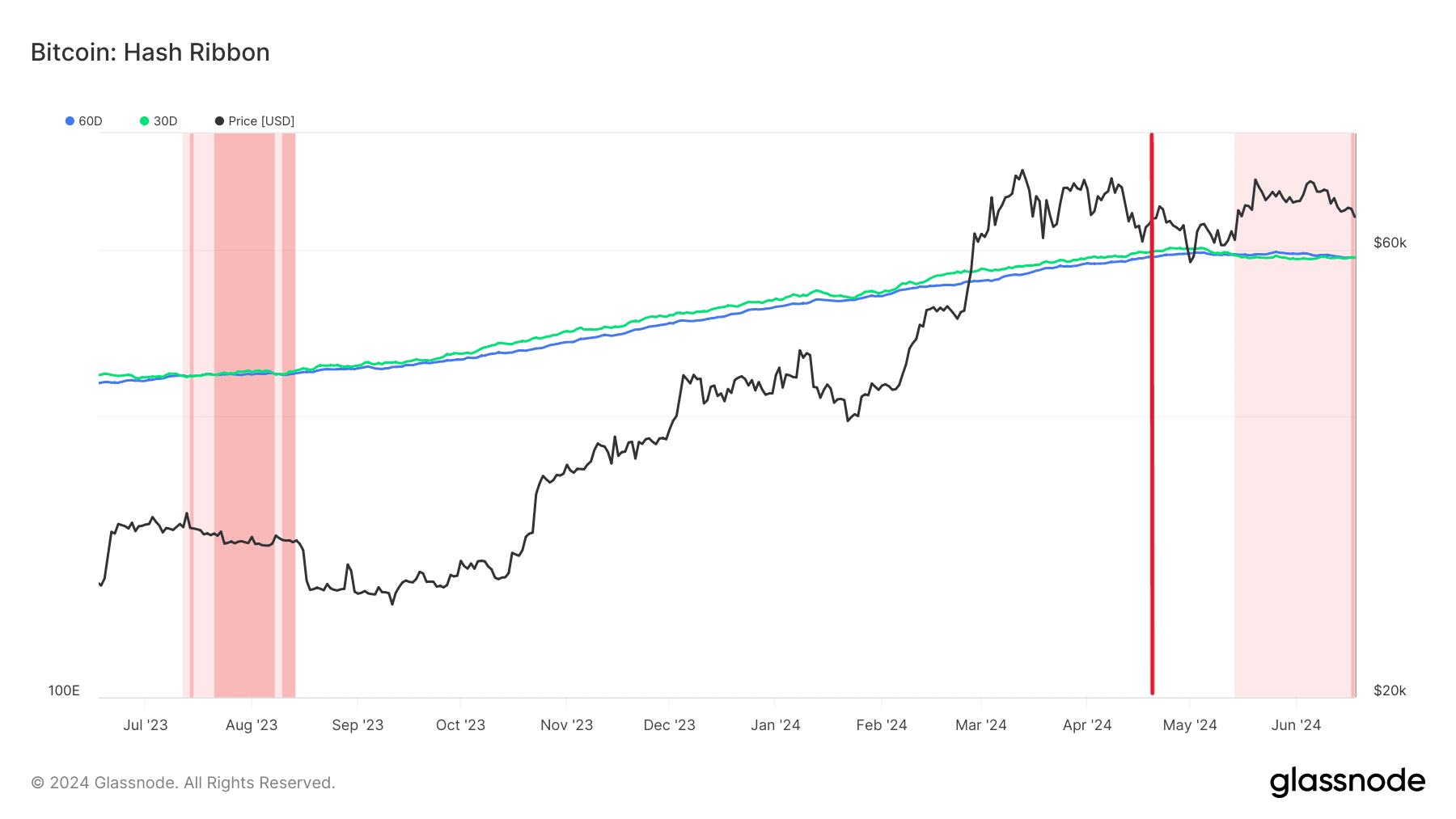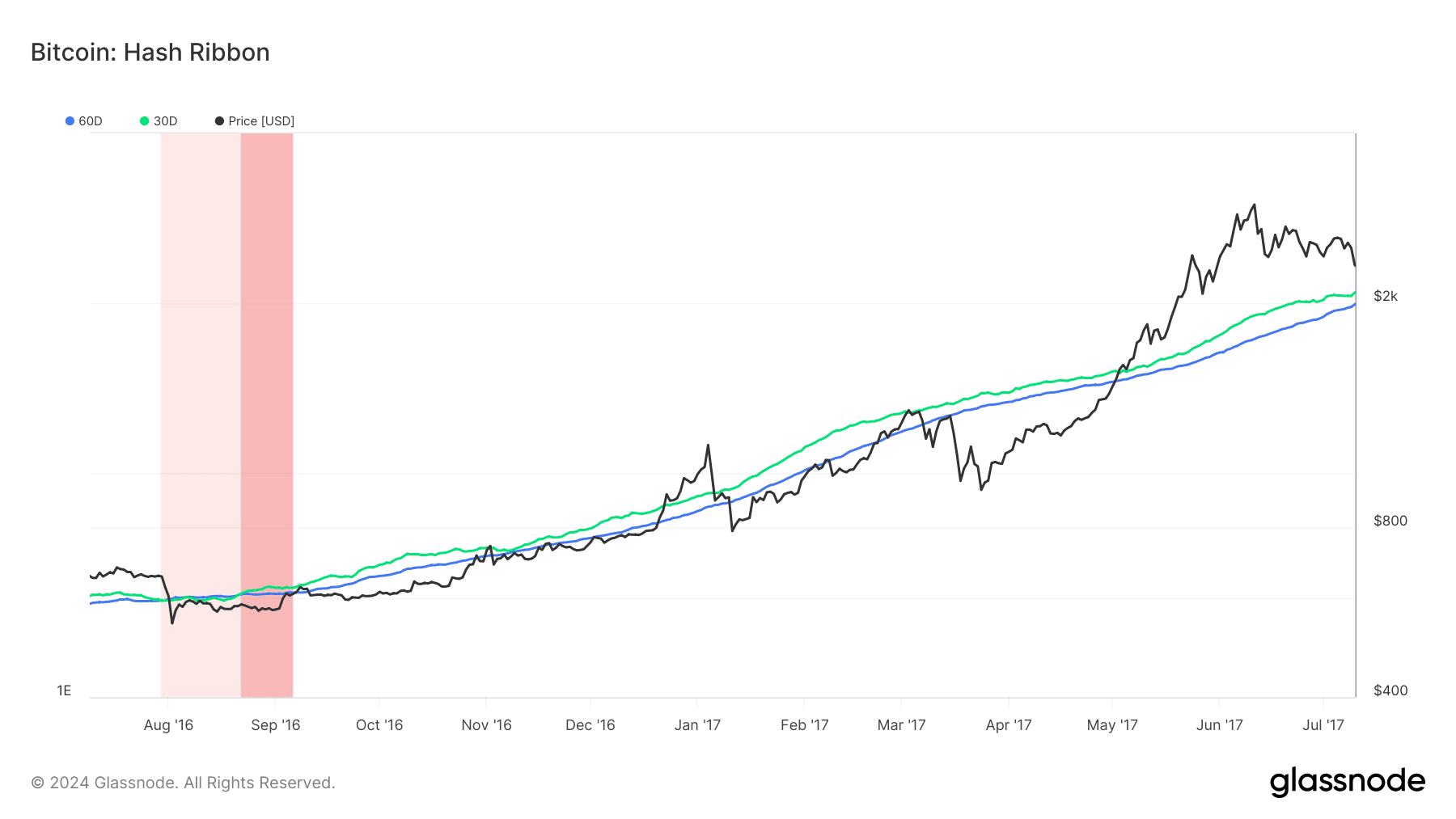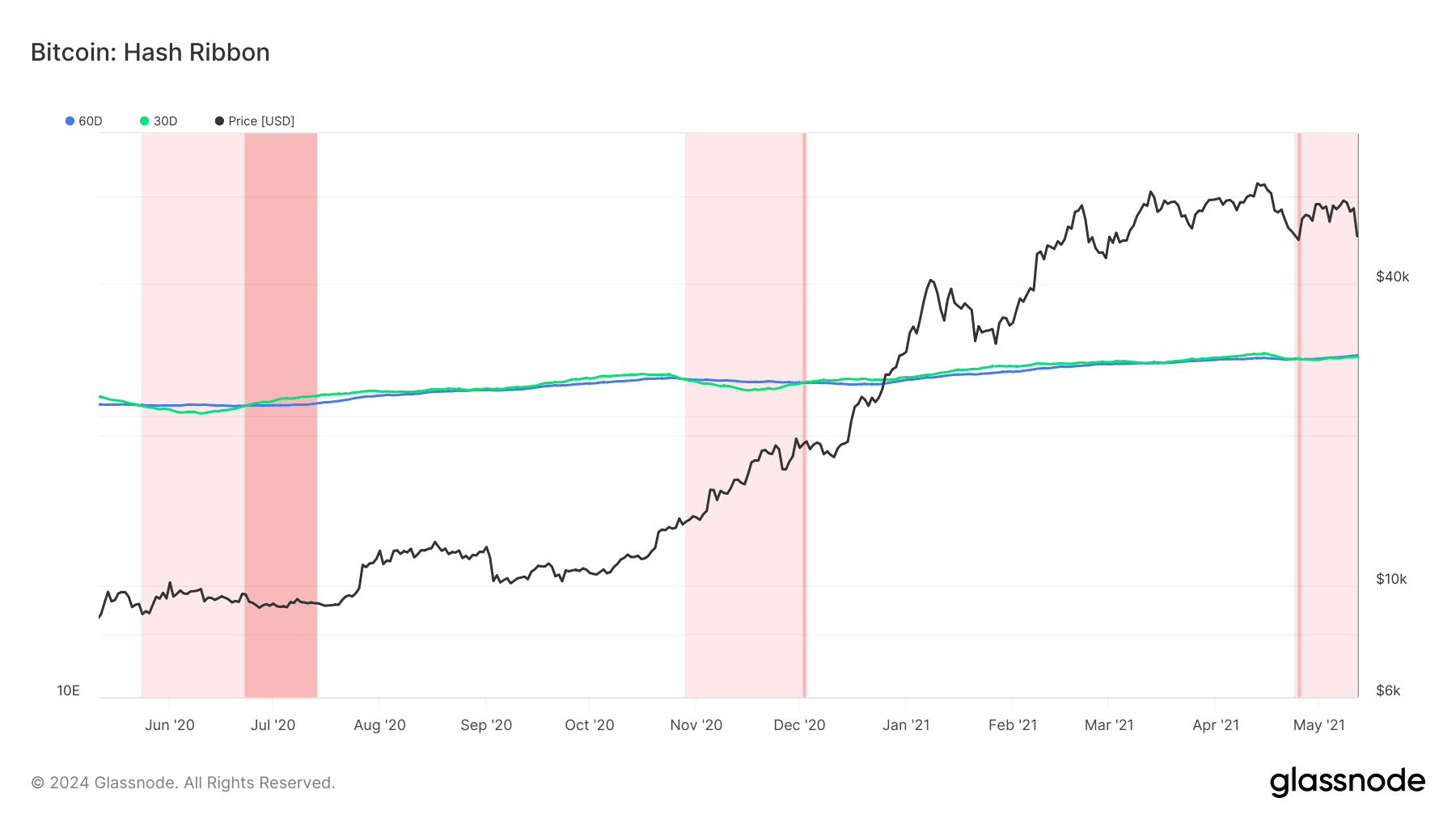 We can also get a more granular view into miner capitulation by looking at Hash Ribbons. The hash ribbon we’re going to be looking at is the most popular and shows us the relationship between the 30-day moving average and the 60-day moving average network hashrate (different “ribbons” show us the relationship between different moving averages, for example, 10-day and 20-day).