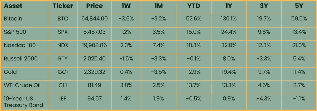 Risk assets and specifically large cap US stocks remain buoyant amid a benign macroeconomic backdrop as we enter summer. Investors digested last week’s lower than expected CPI reading and Fed commentary and came out positive on stocks and rates. Stock indices were driven to new all-time highs this week as NVIDIA assumed the largest market cap in the world. Oil sustained a recent rally back above $80/barrel. Bitcoin price consolidated sideways as hashrate dipped due to post-halving miner capitulation.