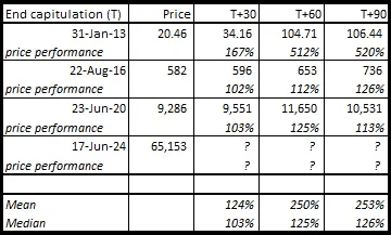 Let’s take a look at what has happened to price after the end of miner capitulation in post-halving environments: