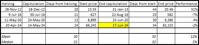 The 30-day post-halving, post-miner-capitulation period we are entering right now has historically seen bitcoin at least double in price.