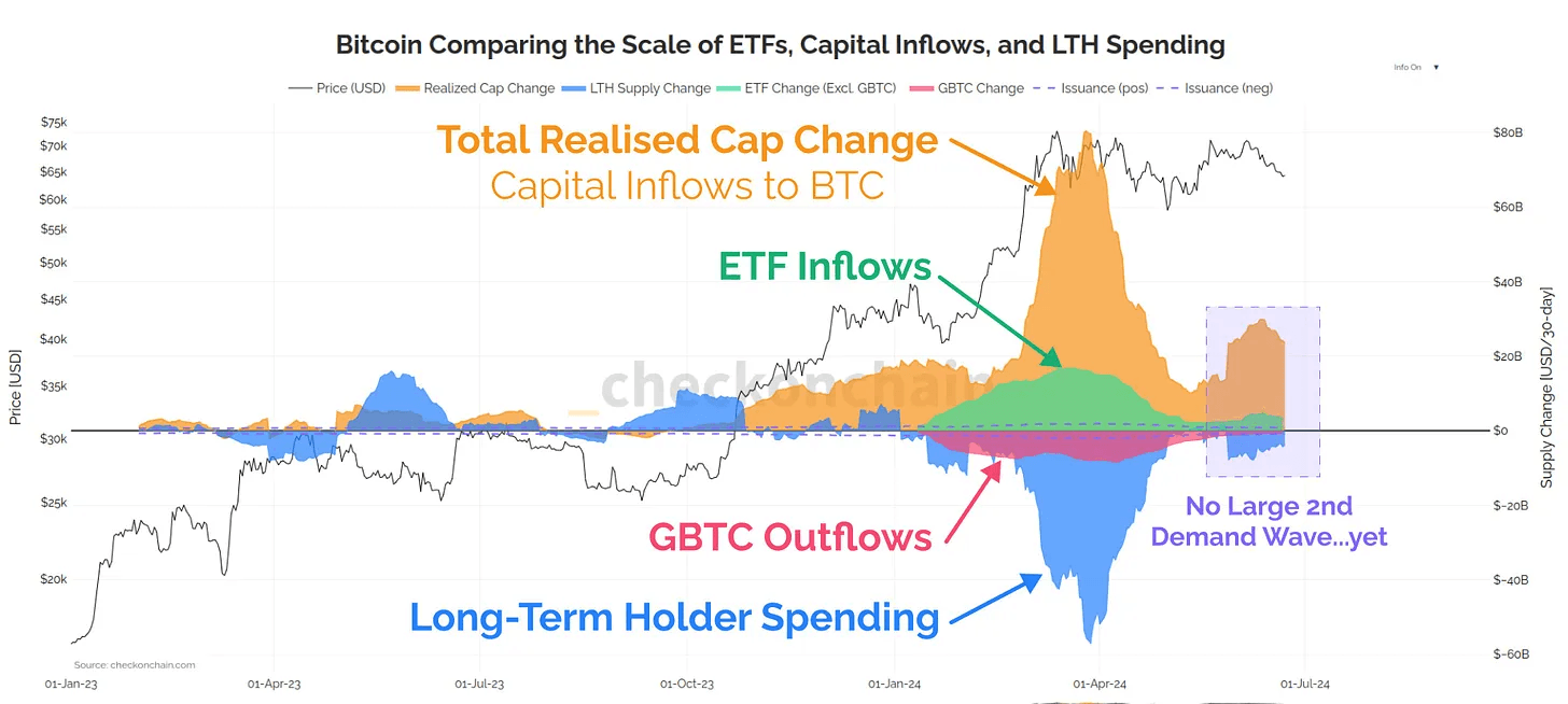 The dramatic change in realized cap, long-term holder supply, and ETF holdings earlier this year paint a picture of massive capital flows which drove price higher, enticing long-term holders to sell.
