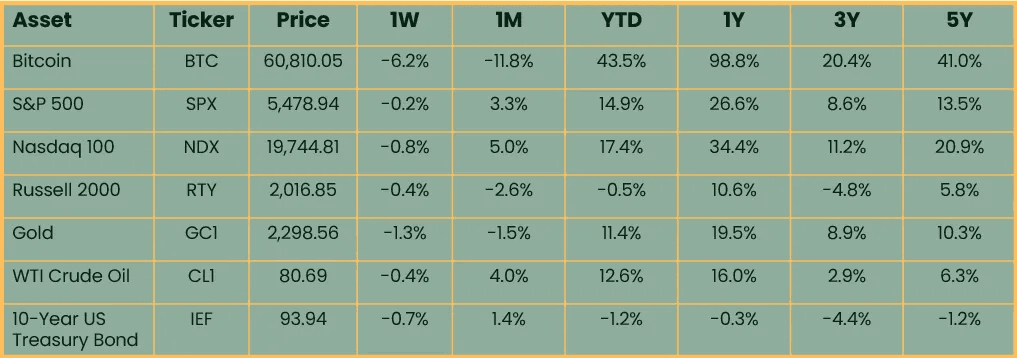 Assets trended down modestly across the board this week as traders fled the desk for summer vacation. Bitcoin was the biggest dropper, losing 6.2% on the week and dropping below the $60k level at one point. Stock indices were down a few tenths of a percent, but under the hood there was some rotation. Nvidia dropped 16% from its intraday high last Thursday before regaining some ground, and gave up its briefly held title as world’s most valuable company. At the same time, forgotten Magnificent 7 constituents Amazon and Tesla rallied 6%. Gold ticked below $2,300/oz as it searches for a bottom after a big rally to start the year. Oil fell 40 bps and bond yields ticked higher.