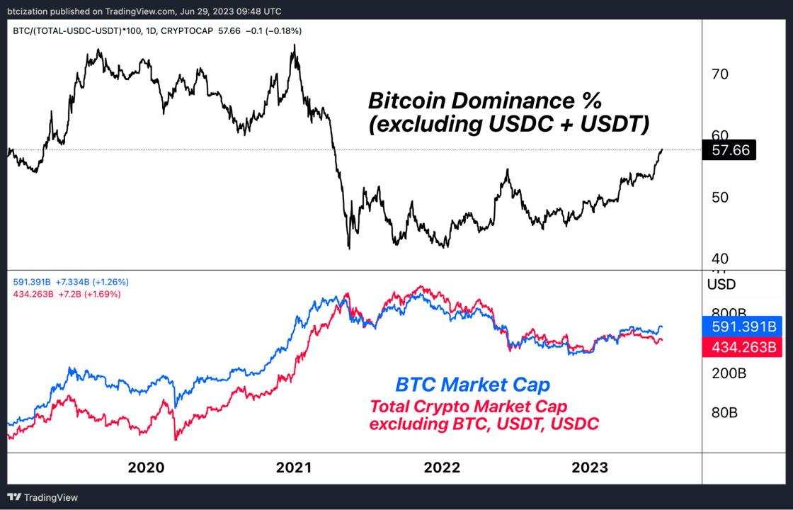 Bitcoin dominance, less major stablecoins, continues its steady ascent, fueled by emerging institutional support and increasing regulatory clarity within the broader crypto space. Despite being an imperfect gauge, the upward trend provides a glimpse of signal shining through the noise.