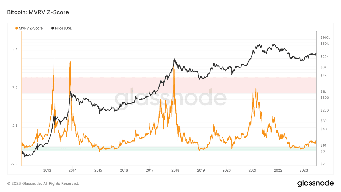 Considering the Realized Cap metric, which assigns distinct values to each portion of Bitcoin’s supply based on when it was last moved, the MVRV (market value to realized value ratio) Z-Score proves to be a crucial market gauge, standardizing Bitcoin’s relative valuation by finding the difference between the market cap and realized cap, while taking into account the volatility of the market cap via a standardized z-score.