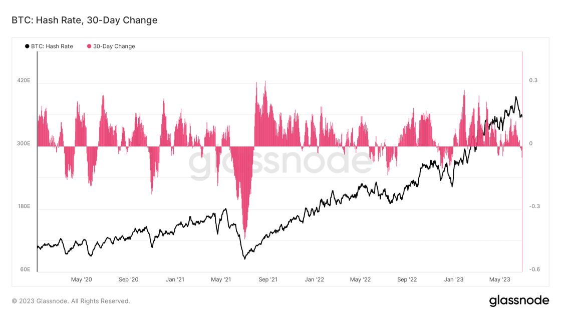 Bitcoin hash rate has slightly fallen from all time highs of 393 EH/s, down a mere 5.3% month over month, with the latest mining difficulty adjustment recently coming in at -3.26%, the largest downward revision since January.