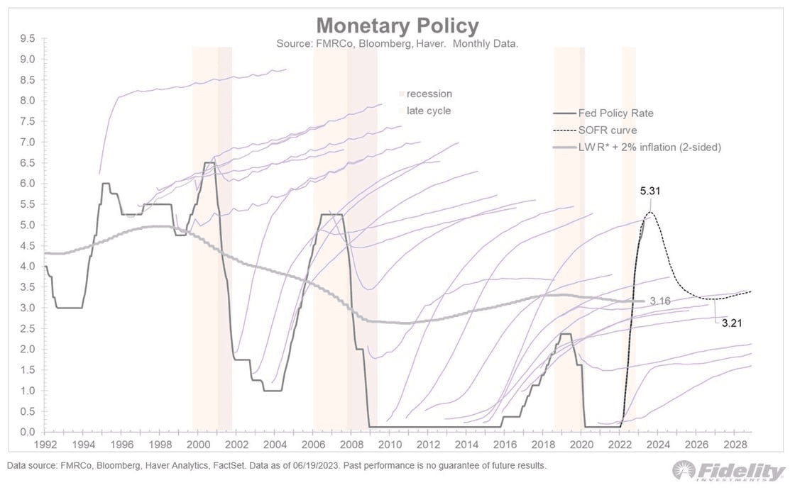 Expectations in the short-term interest rate show the possibility for two additional interest rate hikes during the rest of 2023 before approximately six cuts (143 basis points) in 2024.