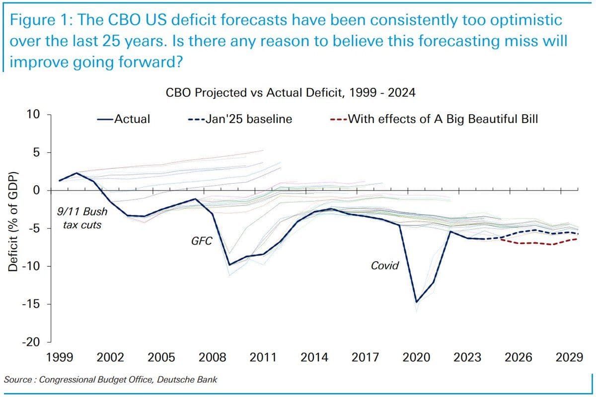 "A quarter century of CBO deficit forecasts: projected vs actual."