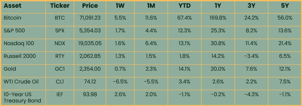 Risk assets sustained a broad rally over the past week, fueled by the market pricing in more and sooner interest rate cuts as some economic data came in weak. Inflation concerns were quelled by a plummeting oil price and broad weakness in commodities. Oil was down 6.5% and is now up a mere 3.4% year-to-date after being up as much as 23% earlier in the year.