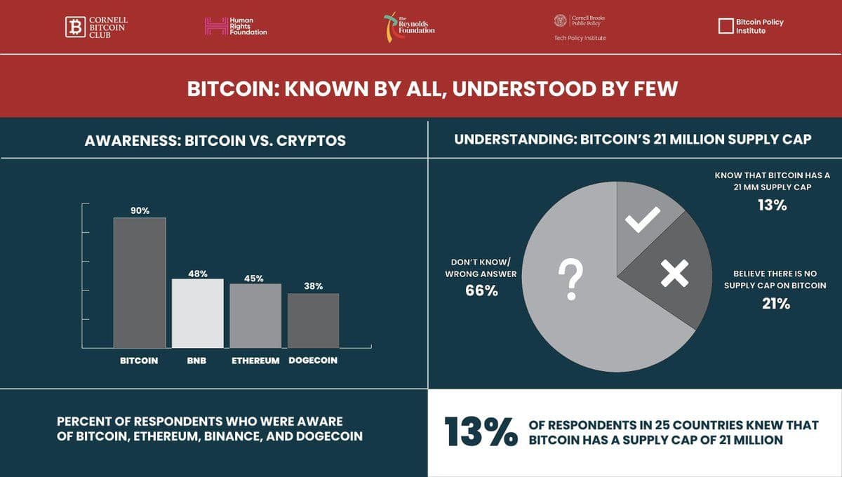 "The Cornell Bitcoin Club conducted a survey which revealed 90% of people have heard of #Bitcoin. Only 13% know it has a 21 million supply cap."