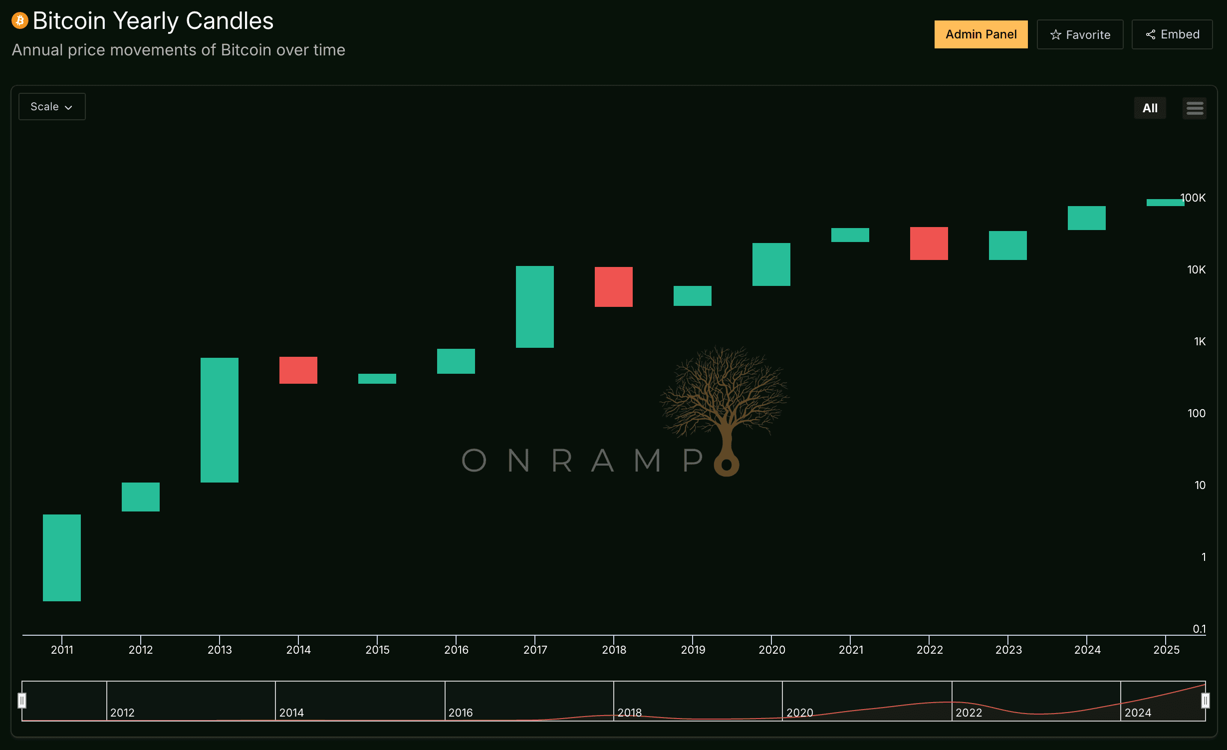 But even those who bought the 2021 peak (~$69K) and held through the drawdown are now up over ~70% cumulatively and ~15.7% annualized (outpacing S&P 500 returns of 34% and 9.9%, respectively).
