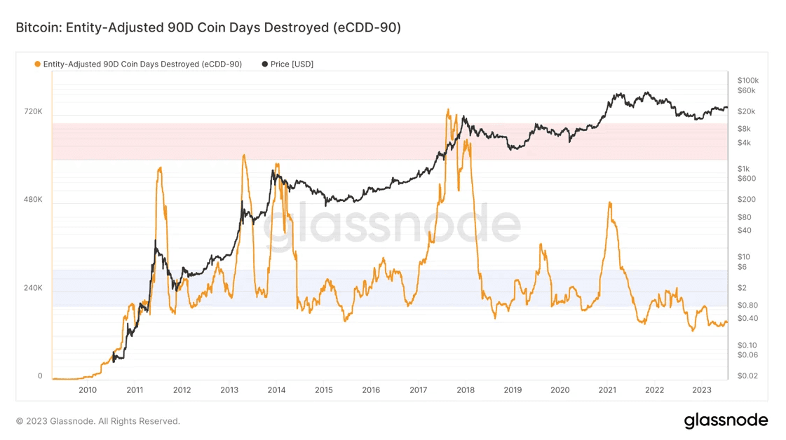 Another interesting metric we can derive from the bitcoin blockchain is a concept of “coin days”, where 1 BTC will generate one “coin day” after not being spent for a full day. This follows true for any number of coins held for any number of days, with the product of the two generating the total amount of coin days aggregated. In our case, we find it useful to look at how many coin days have been destroyed over the recent period, which a 90-day rolling sum shows is near historic lows.