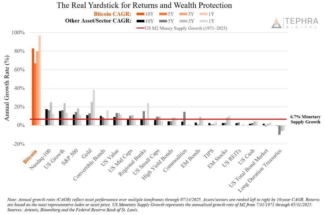 "Your portfolio returns need to stay above the Thin Red Line. Otherwise, you’re losing wealth. Only a few assets consistently outperform monetary expansion. Bitcoin leads the pack in wealth creation by a country mile. It’s a matter of keeping up with the Joneses or beating them. You choose."