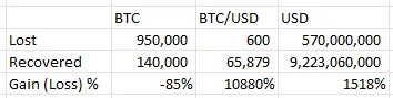 Bitcoin was trading at about $600 at the time of bankruptcy over a decade ago. If we take 140k recovered against 950k lost and assume a ~15% recovery, we can calculate that creditors who lost bitcoin in the 2014 hack are currently sitting on a ~1,518% gain due to their forced decade long hodl, despite losing 85% of their BTC.