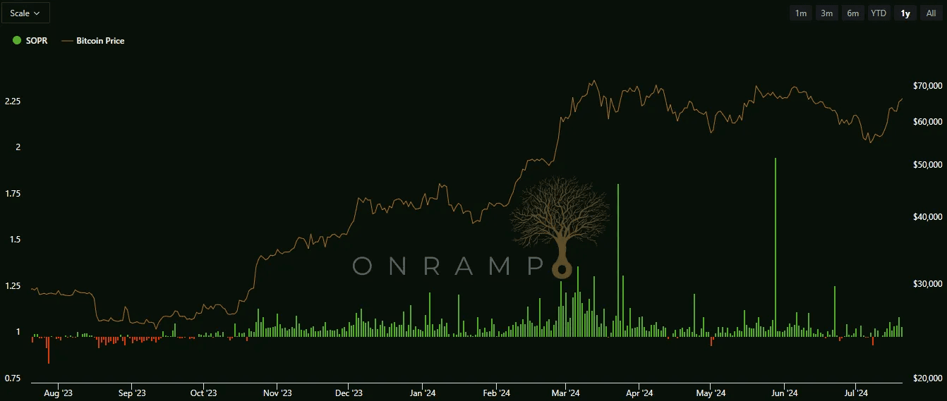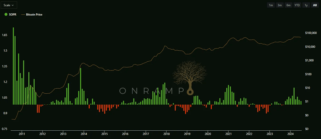 The bottom chart shows a more granular view of the daily SOPR over the last year. It shows that we’ve been in a profitable distribution phase since October 2023 and that daily SOPR did indeed start registering above 1.2 in the March run-up to new all-time highs, although the March monthly SOPR was 1.16.