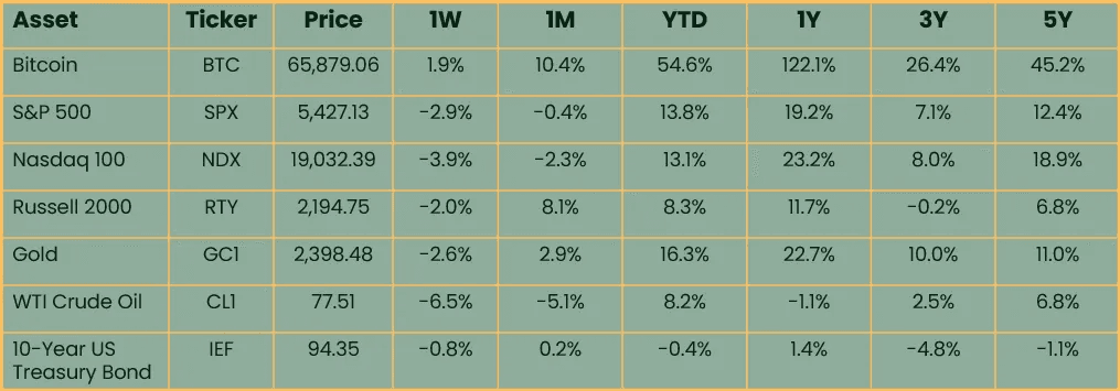 Bitcoin defied other assets classes this week, gaining 1.9% as everything else fell, continuing a recent divergence from stock market performance. Stocks fell as Q2 earnings reports started to roll in. Investors are looking for commentary on continued AI capex spend and for insights on when to expect resulting revenues. The tech-heavy Nasdaq 100 was hit the hardest, down 3.9% on the week and now off 8% from its highs. Small caps continued their recent surge of outperformance, but still lost 2% on the week. Gold, oil and bonds fell in sympathy with stocks as investors weigh recent weakening economic data, such as slowing retail sales and housing starts.