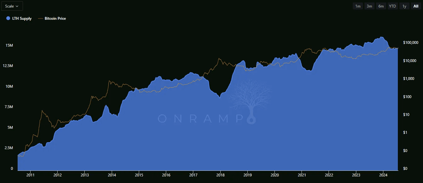 Long-Term Holder Supply refers to the amount of Bitcoin held by investors who have held their coins for more than 155 days. These holders are often seen as having strong conviction in Bitcoin’s future value and are less likely to sell during market volatility.