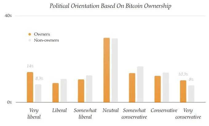 In a representative survey of 3,538 Americans, the Nakamoto Project found that the political spectrum of bitcoin owners roughly mirrored that of non-owners, with owners being slightly more likely to fall into either political extreme.