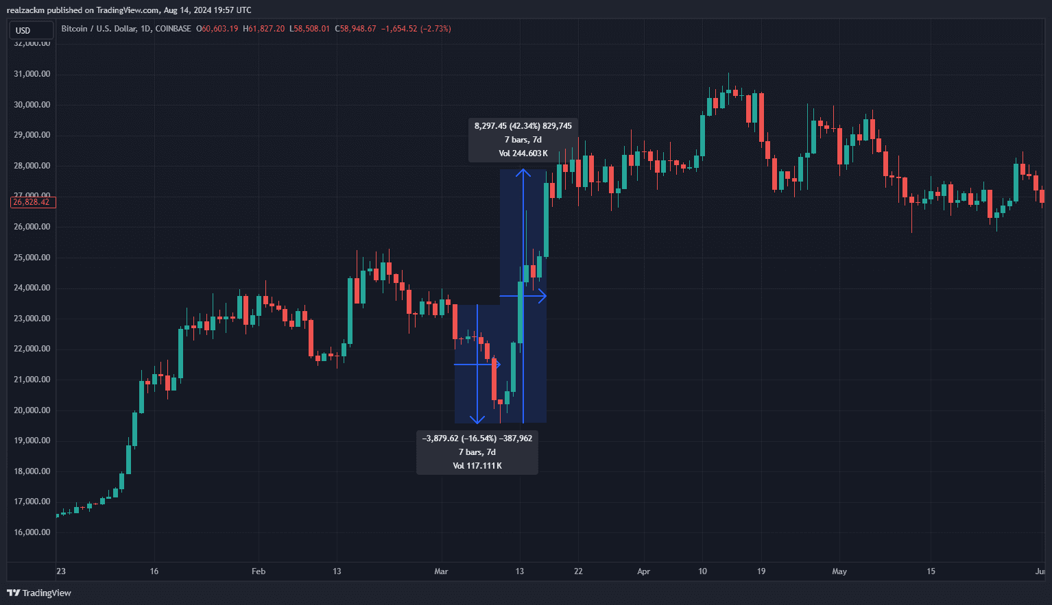 Bitcoin instantly responded to the crisis-averting injection of liquidity. After falling 17% in the week culminating in the bust of SVB, it rebounded by 42% in the following week after officials made it clear that would make depositors at the failed bank whole.