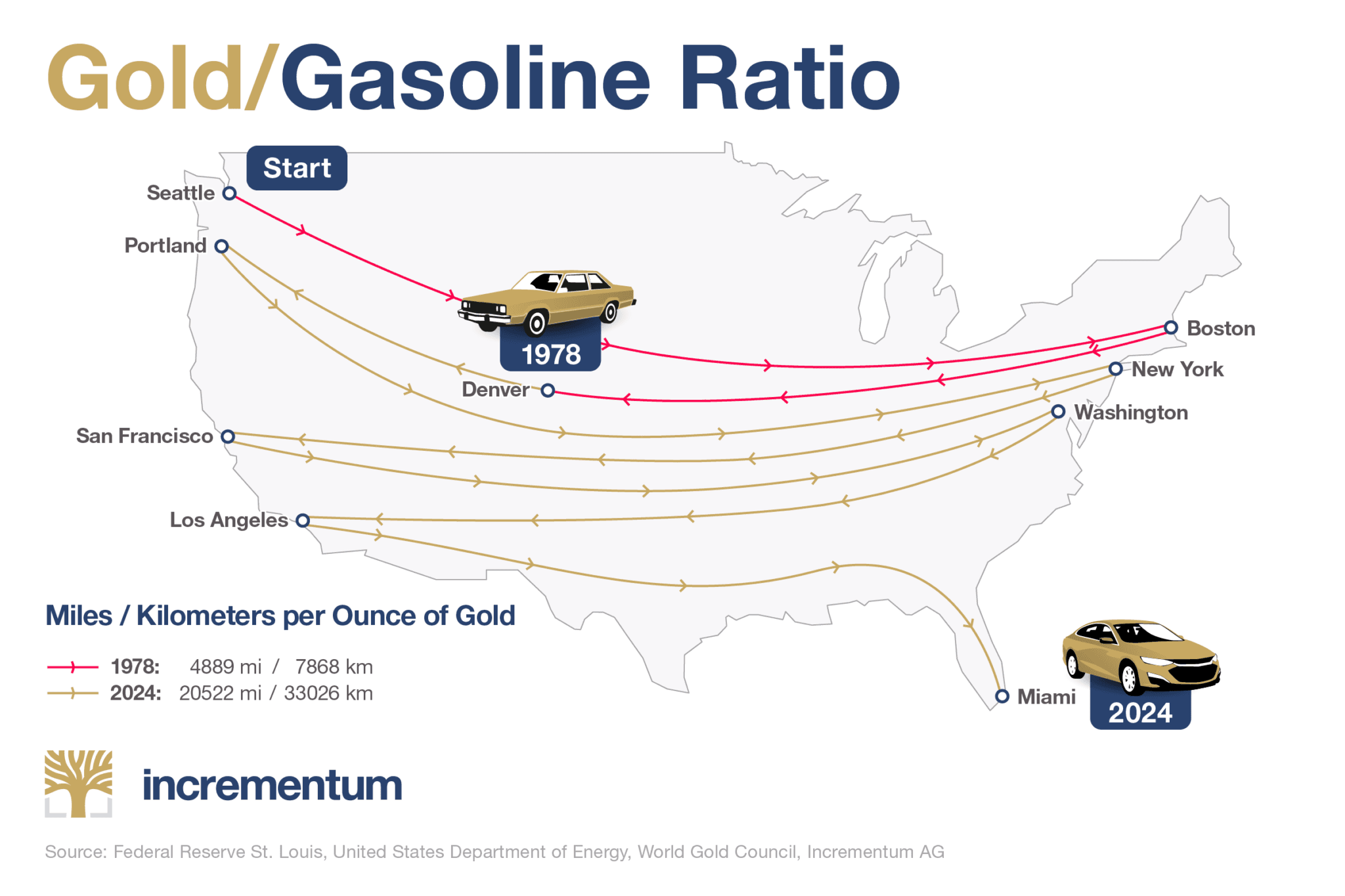 An ounce of gold gets you 15,633 miles further in a car in 2024 than it did in 1978. That’s what comparing a scarce asset (gold) to a non-scarce asset (oil) over a 46 year period looks like. That’s also what technological deflation looks like.