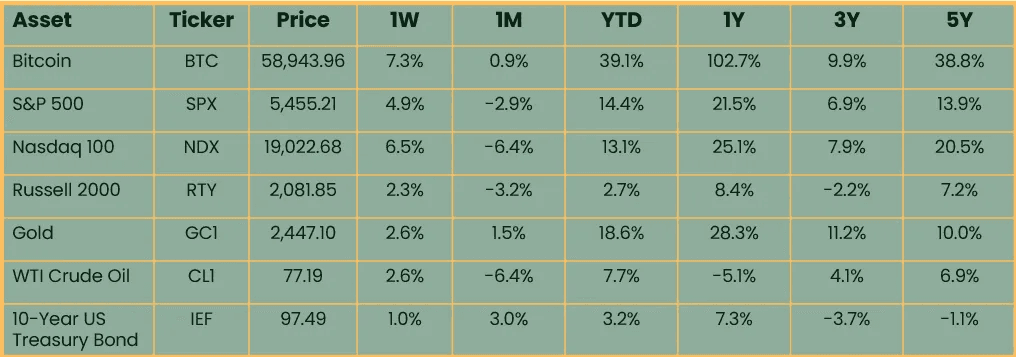 Assets continue to bounce back from the swift drawdown last Monday. Bitcoin has led the recovery, up 7.3% in the last week. Stocks have been right behind, led by mega-cap tech and a strong recovery in AI-story stocks. The S&P 500 and NASDAQ have recovered all of their losses since August 1, when a weak employment report initially sent stocks tumbling. The small cap Russell index is still 5% below its August 1 closing level. Gold continues to shine through the current environment, making a new all-time high this week. Oil rose on fears of supply disruptions stemming from Iran’s threats to attack Israel. Bonds continued to fare well as investors digested a second consecutive CPI print that came in below expectations, furthering the case for interest rate cutting cycle.