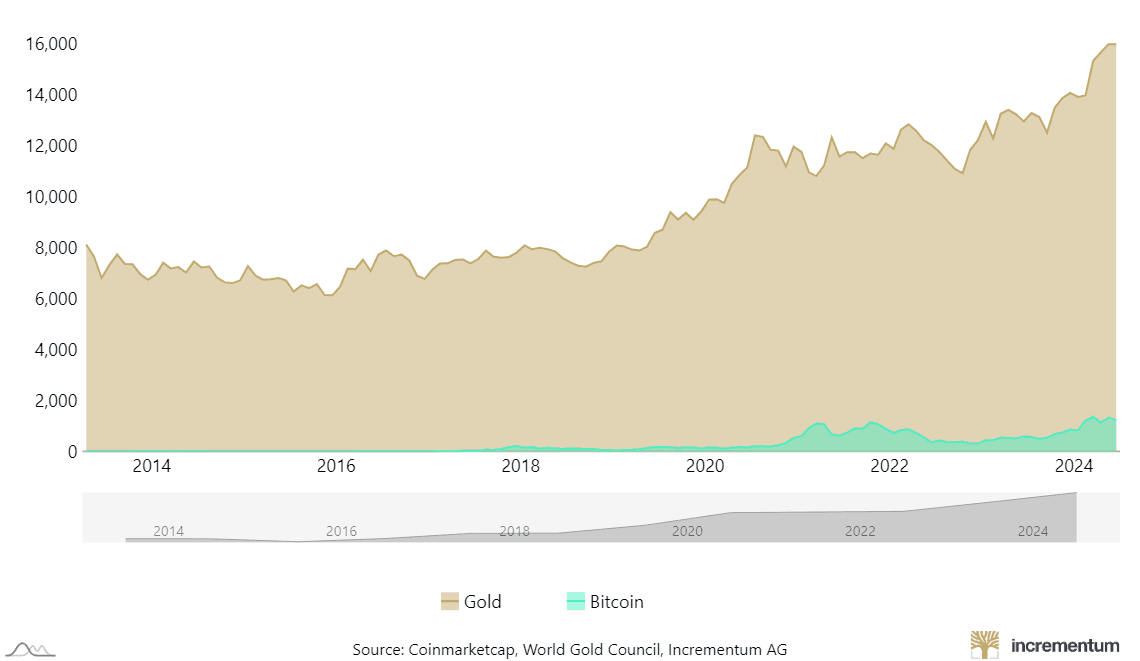 As a reminder, gold is currently at about a $16 trillion market cap while bitcoin is at about $1.24 trillion, a 13x difference.