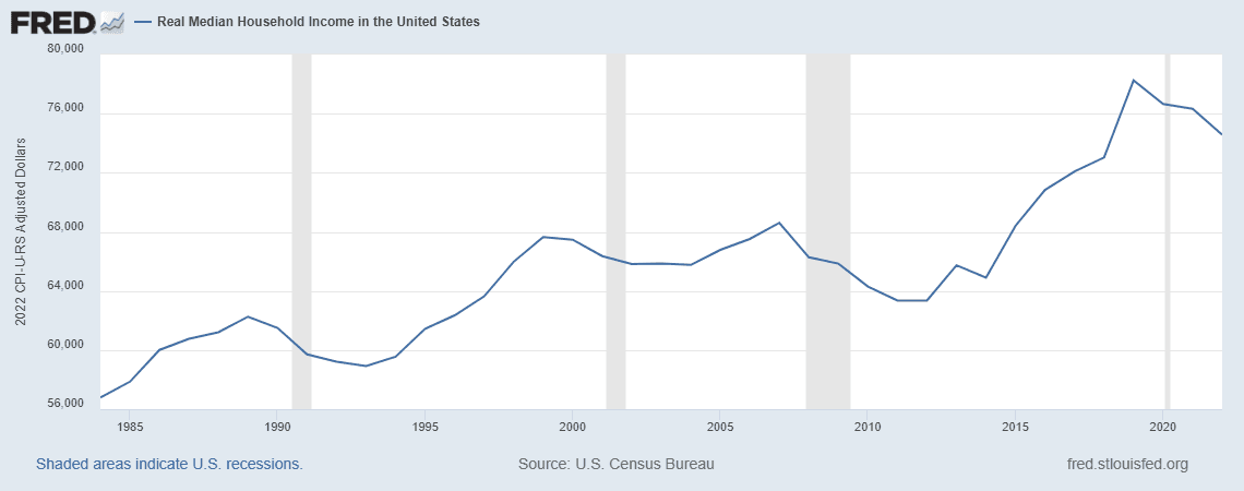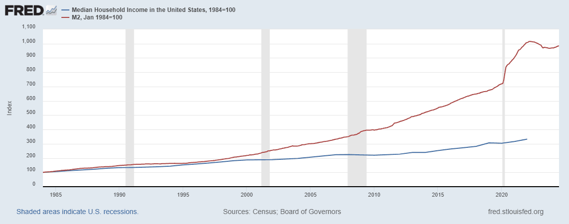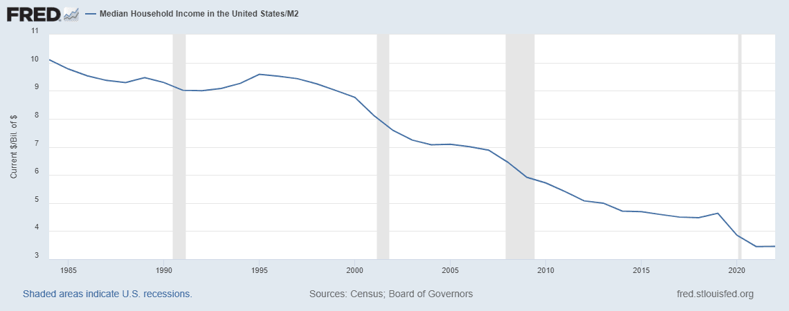 According to FRED data, “real” (CPI-adjusted) median household income is up 31% since 1984. But if you adjust for M2 growth instead of CPI, median household income has declined significantly. Through January 2022, nominal median household income grew 230% since 1984; meanwhile, M2 grew 900% over the same period.