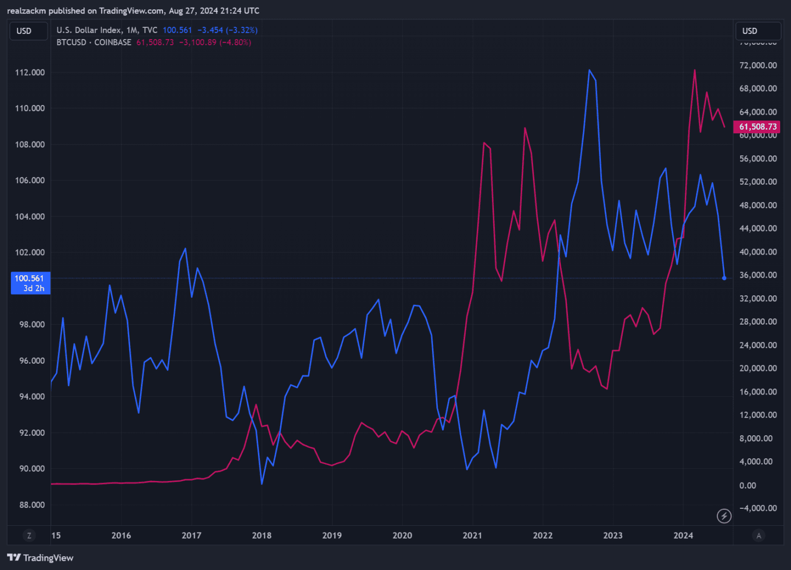As the chart shows, bitcoin (red line) has been inversely correlated with the DXY. For as long as bitcoin has existed, every peak in the DXY has kicked off the next bitcoin bull run.
