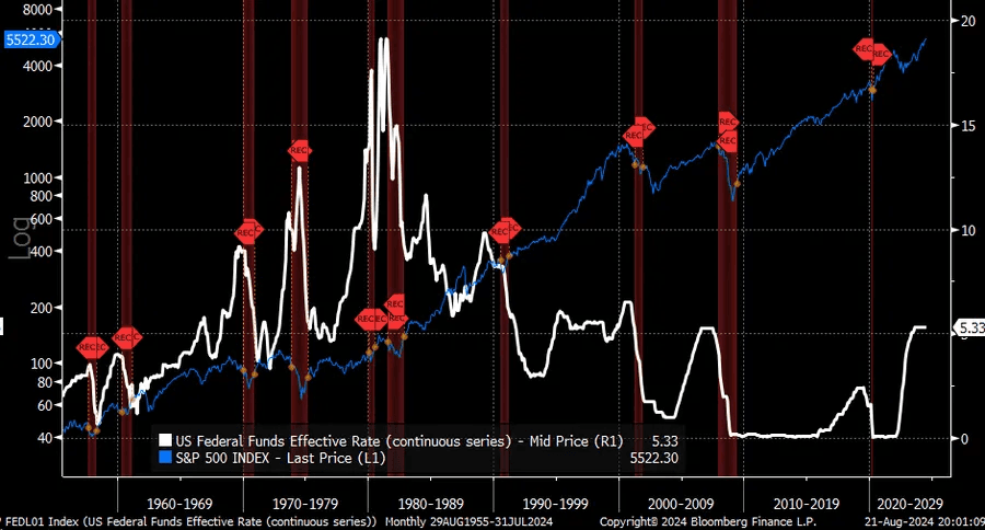 Many have pointed out that the beginning of a rate cutting cycle has historically been bearish for stocks and the economy, citing some version of this chart: