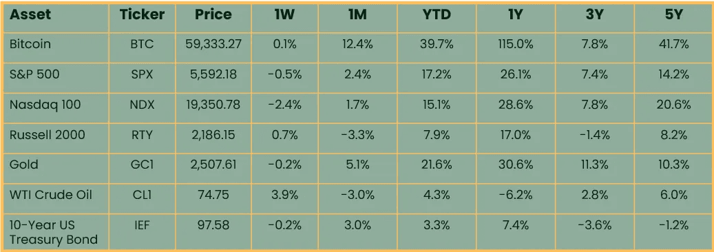 Asset rallied last Friday on Jerome Powell’s dovish comments at Jackson Hole, but gave back those gains in early trading this week. Bitcoin is unchanged over the last week and hovering around the $60k level. NASDAQ was the worst performer as traders were cautious ahead of Nvidia’s earnings report on Wednesday night. Small caps outperformed in equities as they are seen to be the biggest beneficiaries of rate cuts. Gold was flat. Crude rallied 4% on Middle East tensions but is still the worst performing asset over the past year. Treasuries held their recent gains on lower rate expectations.