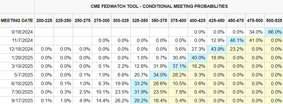 Fed funds futures are now pricing in a 100% chance of a rate cut at the Fed’s September meeting, with a 66% chance of 25 bps and a 34% chance of 50 bps: