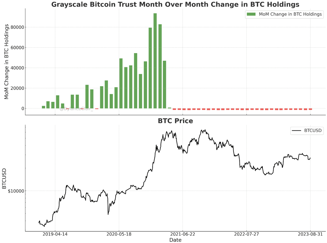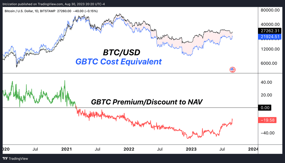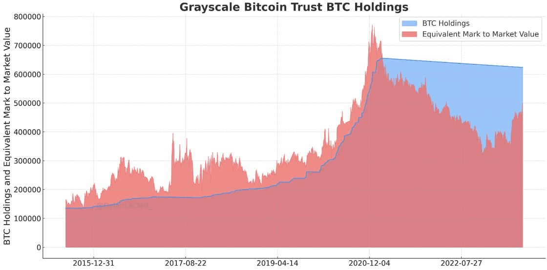The drama has cast a spotlight on the Grayscale Bitcoin Trust ($GBTC), an entity with a commanding hold of over 600,000 BTC. Its considerable market influence has proven to be a double-edged sword. While it propelled the bull market with its mechanisms that encouraged massive capital inflows and created lucrative bitcoin “yield products,” it turned into a hindrance when its shares began trading at a discount to Net Asset Value (NAV). This has had repercussions across the market, contributing to the collapse of various financial entities that were intertwined with the trust.