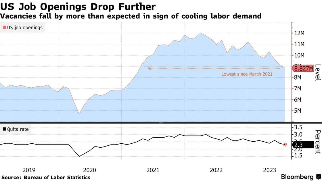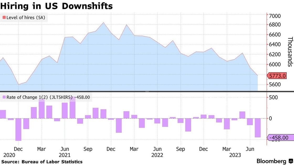 The U.S. job market has signaled a noticeable decrease in demand for labor, reflecting an alignment with the Federal Reserve’s strategic efforts to combat inflation. Job openings fell to 8.83 million in July, marking a more than two-year low, according to the Bureau of Labor Statistics’ Job Openings and Labor Turnover Survey (JOLTS). This dip in available positions comes as part of a broader trend, having marked the sixth decline in job openings in the past seven months. Additionally, the “quits rate,” which gauges the percentage of workers voluntarily leaving their jobs, declined to 2.3%, its lowest point since early 2021.