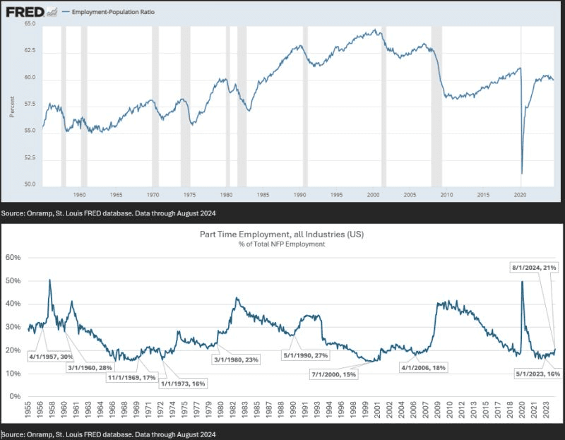 The second graph above suggests that the employment market is bracing for a recession if history holds. Given the combination of employers backfilling part-time workers after over firing and workers filling income gaps with multiple part-time roles…the relationship between recession and rising part-time employment is pretty clear.