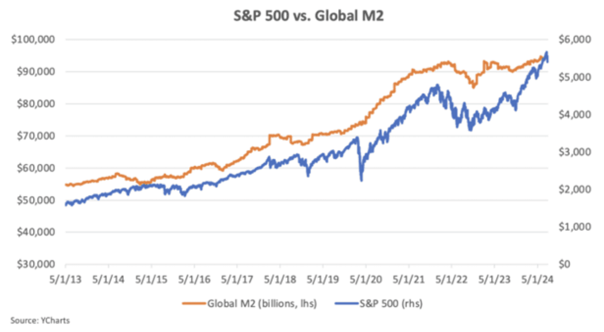 It is the supply of money, not the cost, that drives opportunity and risk in this post-Covid world. In a piece Lyn Alden commissioned with Sam Callahan, we are shown the clear direct relationship between global liquidity (M2) and the price of bitcoin (first chart below), and not surprisingly, the S&P 500 Index (second chart below) as well.