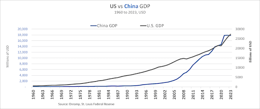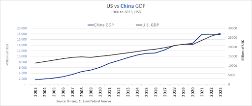 Chinese GDP is virtually flat in USD terms since COVID-19 and has been experiencing declining growth through Q2 2024, potentially breaching the psychologically significant 5% levels by YE 2024.