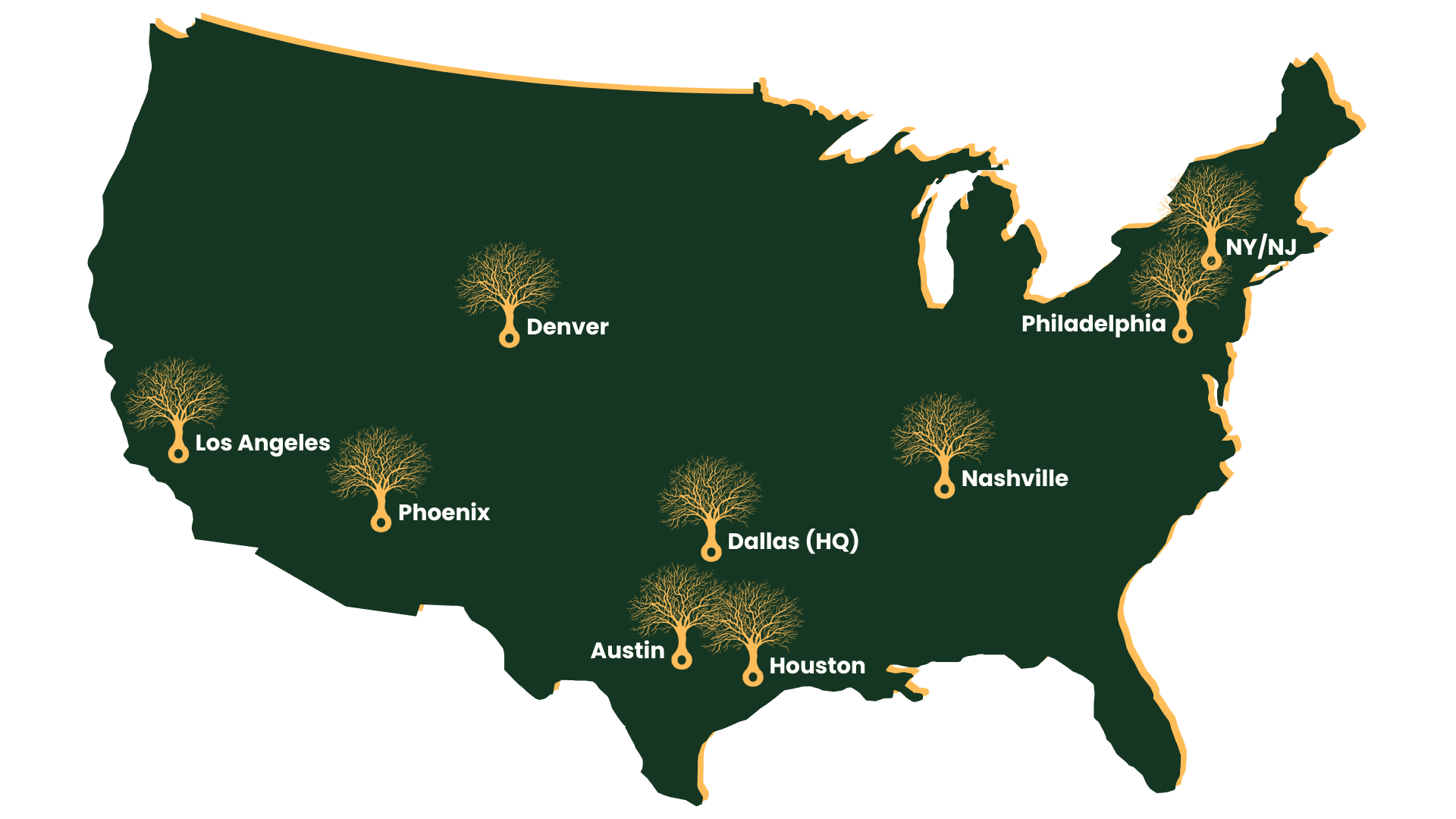 We’re excited to open our doors in key financial and cultural centers across the United States, including New York, New Jersey, Philadelphia, Los Angeles, Denver, Houston, Austin, and our headquarters in Dallas. Our newest branches are located in Nashville and Phoenix.