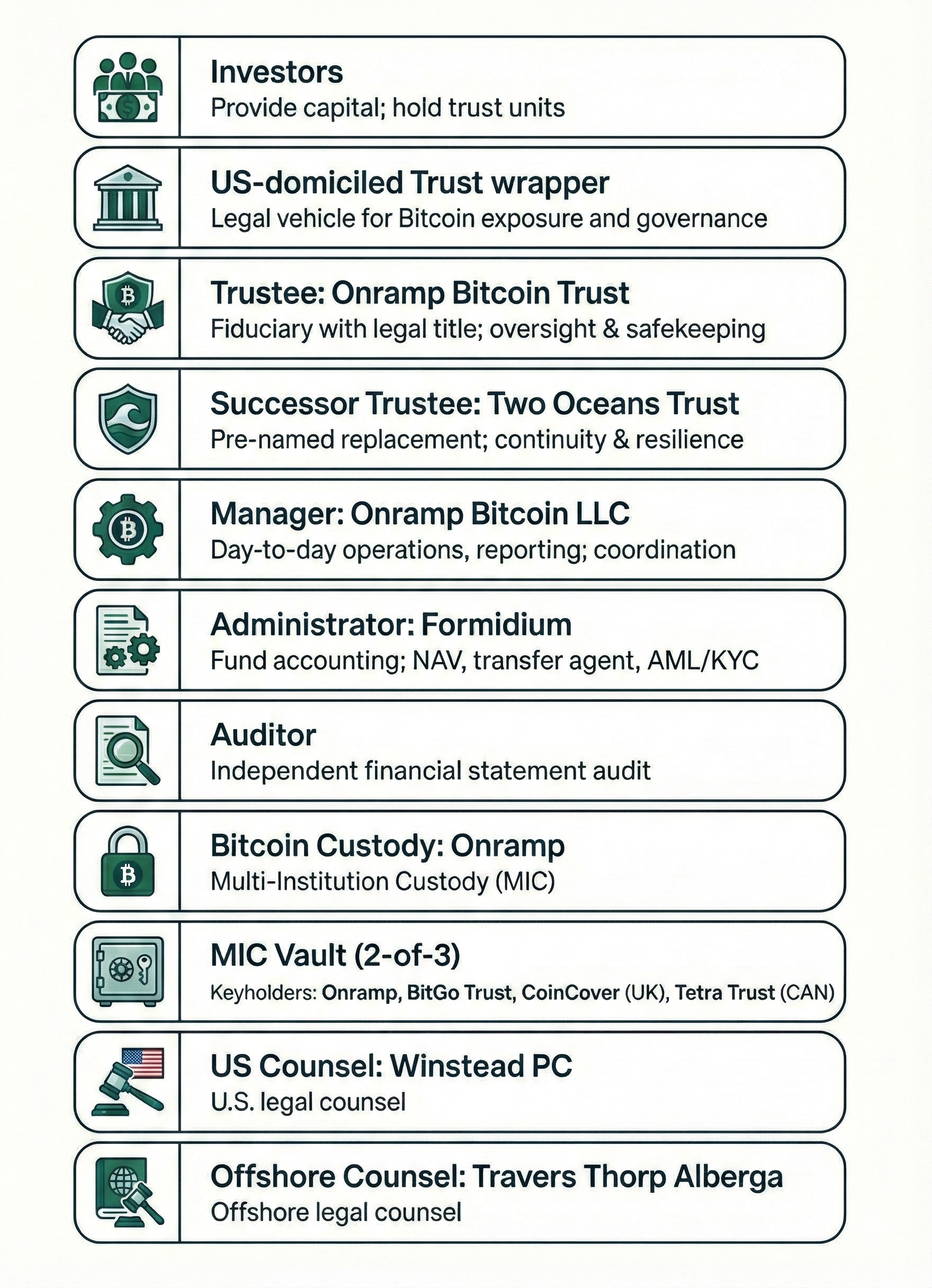 - ERISA-sensitive & pension-adjacent clients who prefer a clearly structured vehicle over direct Bitcoin custody.
