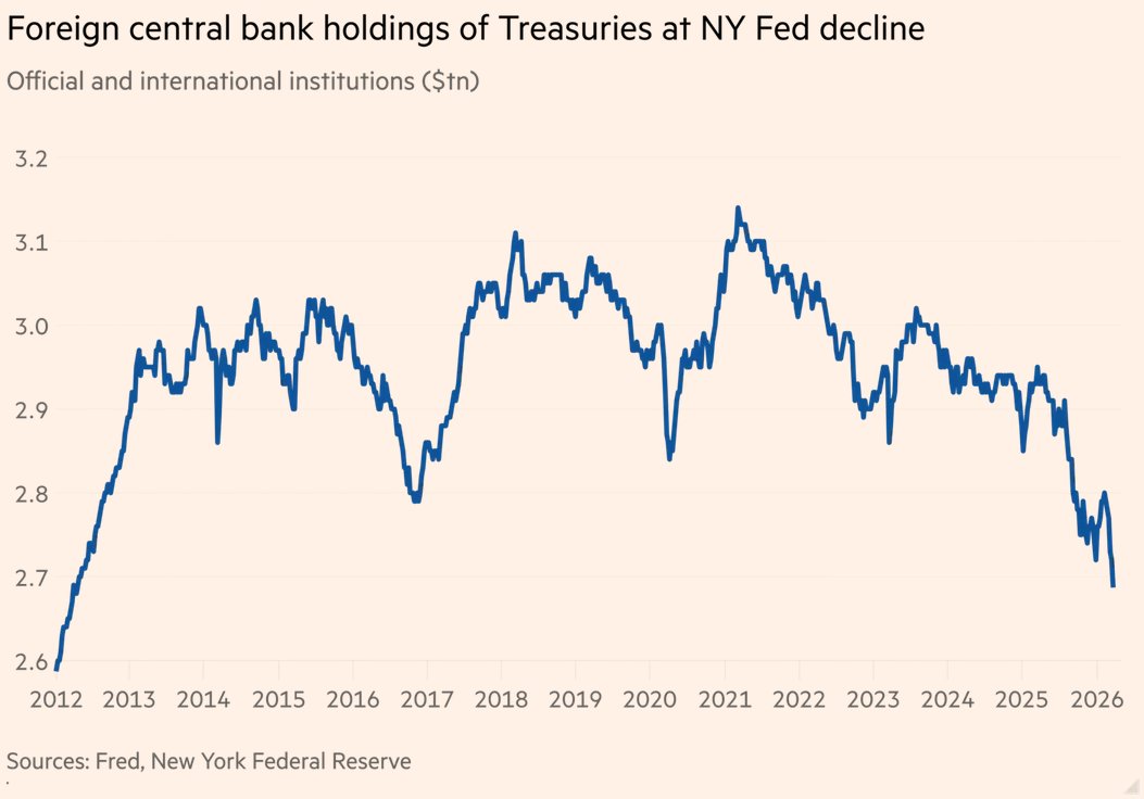The conflict in the Middle East is accelerating both sides of this trade. Central banks have been net sellers of Treasuries since early 2025, and the decline has steepened since the war began. Foreign central bank holdings of Treasuries at the New York Fed have dropped from a peak above $3.1 trillion in 2021 to roughly $2.7 trillion, a drawdown of over $400 billion. The dollar's share of global FX reserves has declined from 71% in 2001 to about 58% today. A record 43% of central banks plan to increase gold holdings in 2026.