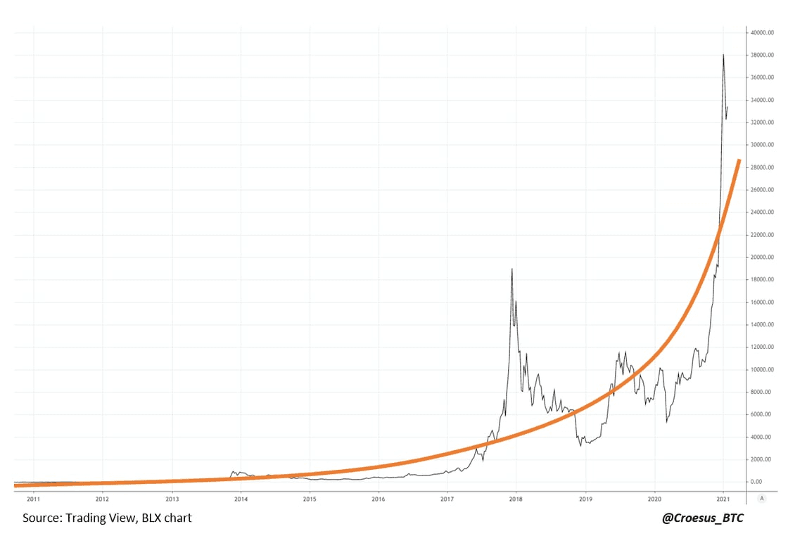 If we take this exponential decay trend and fit it into our logarithmic view of the various asset classes, we get something like this: