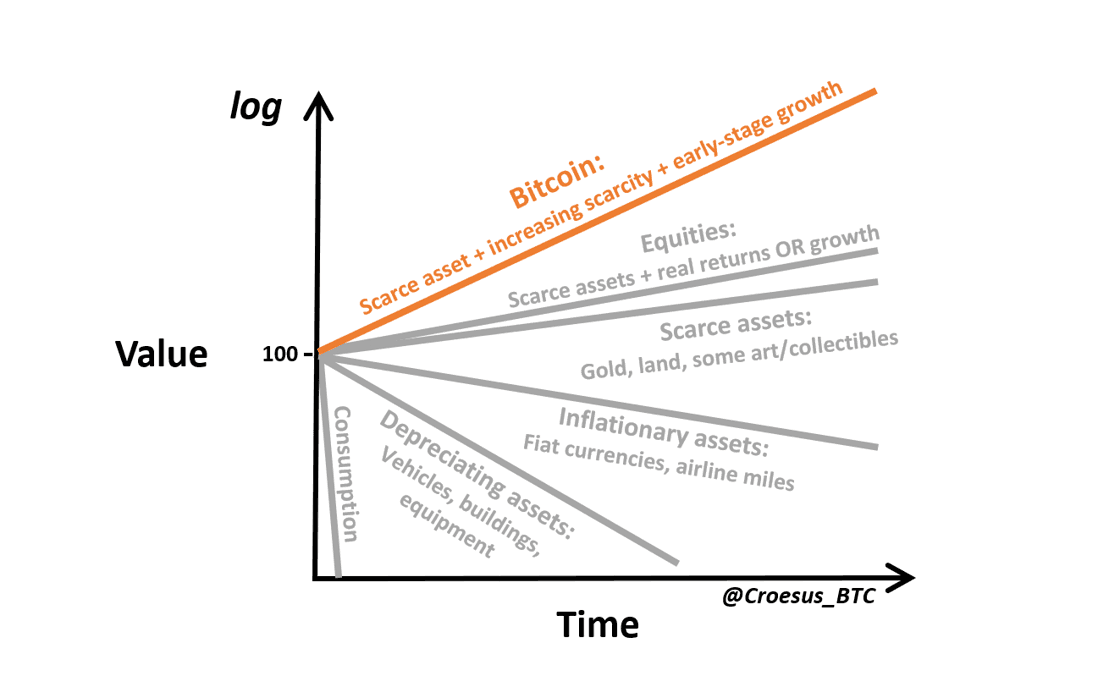 When we represent this exponential orange curve on a logarithmic y-axis, it becomes a straight line. If we attempt to fit it into our simplified view of asset type performance over time, we get something like this: